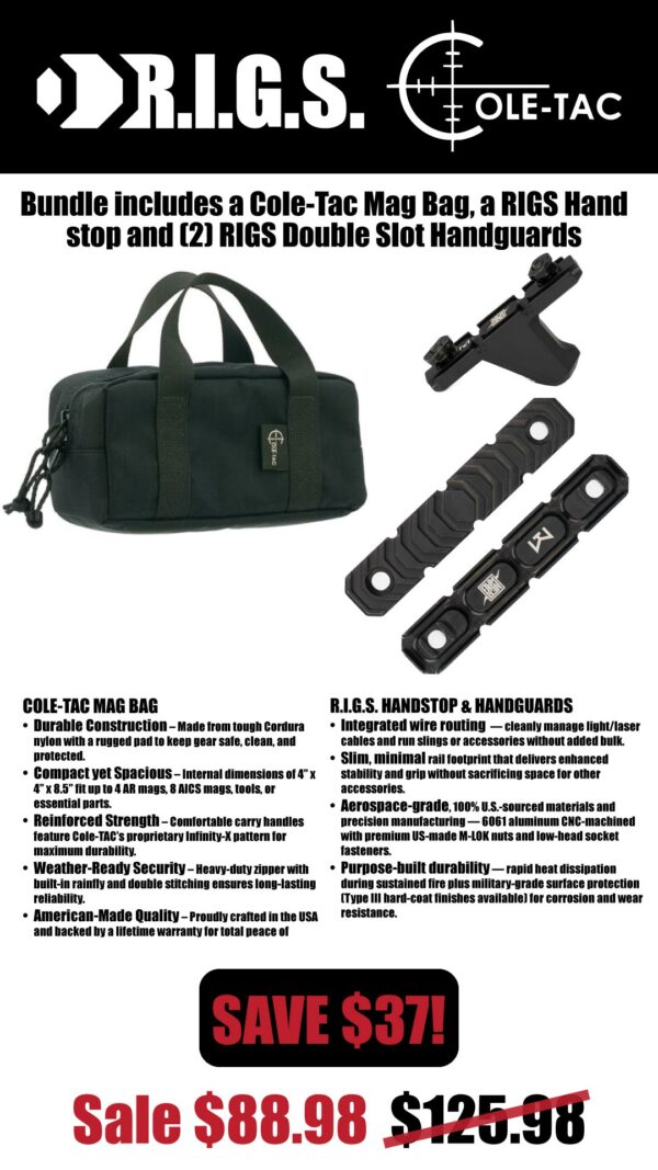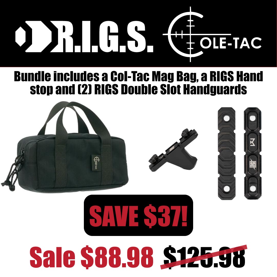 Buy this bundle, save some cash! You get 2 double slot, black R.I.G.S. panels, a black R.I.G.S. Handstop, and a ColeTac Mag Bag. Equip your rifle and load your magbag up for your range trip. Check it out now!
